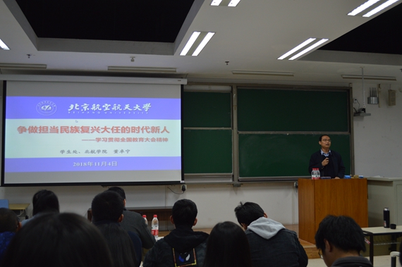 董卓宁老师从时事政治谈起,介绍了习近平总书记近期出席2018年全国教育大会的重要讲话以及历届全国教育大会的核心内容,深入浅出地为同学们讲解了全国教育大会的内容,传达了全国教育大会的核心精神,并联系北航新时期的发展方向和目标,引导同学们争做新时期的时代新人。