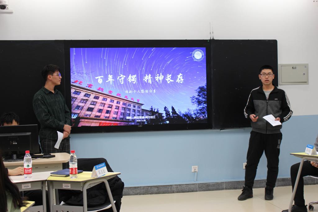 在第二部分“厚植空天情怀”中,班级中曾担任《百年守锷》(11月7、8日上演)话剧组分场导演和主演的两位同学,分享了在话剧排演过程中的收获与感想,带领同学们一起学习屠老精神,全面展现了老一辈北航人的空天报国精神。