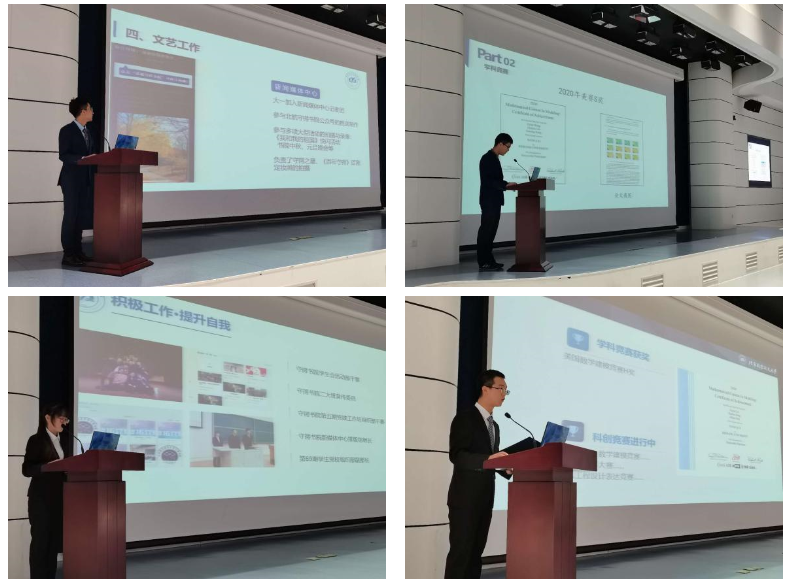 答辩的同学就学业水平、学科竞赛、科技实践、社会工作、文体活动、党建工作几方面做了自我阐述。参与的竞赛以及活动包括:美国大学生数学建模竞赛,冯如杯学生创意大赛,党建工作坊,朝阳支教活动,梦拓活动,守锷百年话剧,朝阳支教活动,小桔灯志愿服务,童年一课线上支教,数据分析,发表论文。他们合理协调自己的时间,以实际行动给大一一年交上了一份完美的答卷。