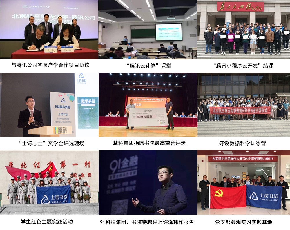士谔书院协同腾讯公司共建“志士航行”创新实践实习基地。邀请腾讯认证培训师主讲,书院持续与腾讯联合开设《腾讯云计算》、《腾讯小程序云开发课》等校企合作兴趣课程,课程内容结合实战应用场景,通过学习知识与培养能力实践结合,帮助学生深入了解相关信息领域的基础概念、行业发展以及技术架构。书院协同慧科集团共建“信息产业前沿认知与创新创业能力实训”课程,共同组织开展“云计算与大数据”产业前沿系列报告,助力学生了解云计算和大数据技术产业发展需求和现状,把握行业发展前景和未来方向。慧科集团捐赠书院最高荣誉评选,设立“士谔志士”奖学金,表彰爱党爱国、品学兼优、服务书院和同学的先进典型个人和团体。首届奖学金评比共评选出团体奖项3个、个人奖项21人。书院协同91科技集团共建“信息助力企业发展、红色实践人才培养”思政育人红色“1+1”品牌项目。集团董事长、书院特聘导师许泽玮结合自身创业经历为书院学生作《立大志 入主流 让青春在奋斗中闪光》报告,激励学生听党话、跟党走。书院还多次组织学生前往91科技集团总部实践调研,实地感受集团将党建工作扎根于企业核心文化之中,服务于首都的金融、科技、文化等建设。