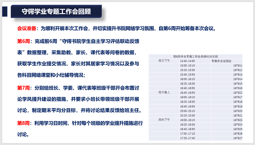 此外,执行院长李广玉针对当前阶段班主任对各小班学业关注工作的支持表达了感谢,对书院后续提升学业工作的措施进行了汇报和总结。
