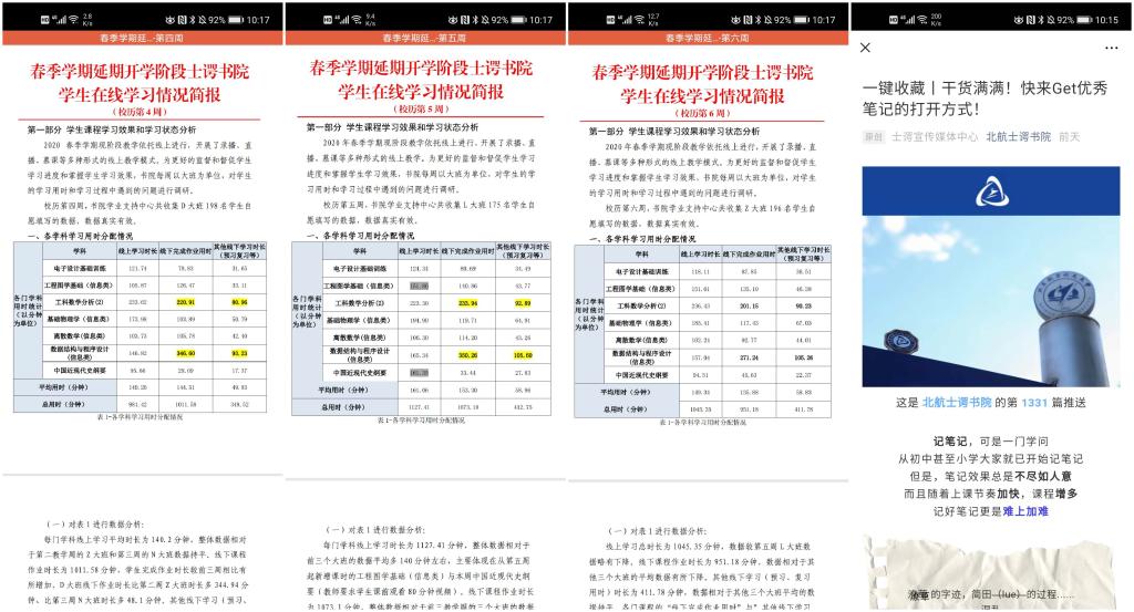 书院通过调研先后形成五期《春季学期延期开学阶段学生在线学习情况简报》,围绕调研中反映的居家学习参考资料少、学习效率低等问题,在“学习日”同步发布了“一键收藏”系列笔记教学专题经验分享推送:宣传展示了优秀学生笔记、重点分享了做好笔记的四种方法、整理推荐了相关在线电子笔记“神器”。书院将进一步围绕提高居家学习专注度、设置每日生活计划、指导居家健身方法、分享居家厨艺“大赏”等主题进行教学分享,在居家自主学习阶段持续引导学生养成良好学习习惯,进一步提升居家学习效率。