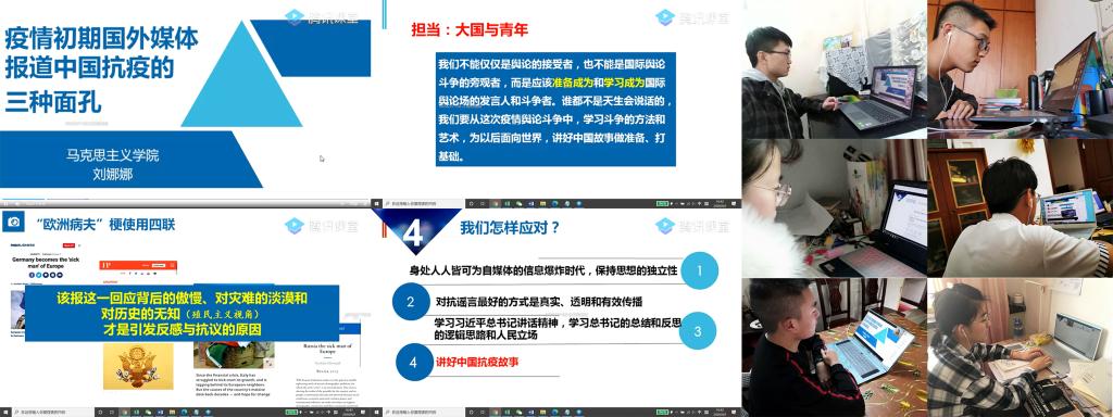 在本期联合党校春季班开班仪式上,冯如书院本科学生党支部和冯如党建工作坊依托“大国战疫”系列专题思政课,开展线上集中学习。课程由马克思主义学院副教授刘娜娜老师讲授“大国战疫”系列专题思政课第一讲,主题为《疫情初期国外媒体报道中国抗疫的三种面孔》。课程充分展示抗击疫情的国际比较,从理论维度分析原因,明确了对待外媒的谣言和舆论诱导所应当持有的正确态度,并且树立了作为大国青年的信念与担当,作为疫情防控时期书院学生“学习日”和入党积极分子培养的补充环节,助力学生党员和入党积极分子增强“四个意识”、坚定“四个自信”、做到“两个维护”。