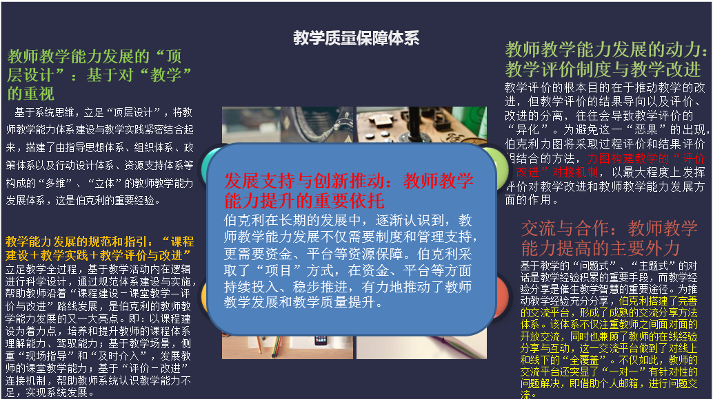 加州大学伯克利分校自建校之初,就非常重视教学,因此组建了教学与学习中心,聘请具有丰富教学经验,能够得到学校教师及同行认可的人员从事中心工作。此外,还采取了强化顶层设计重视教学文化;立足教学活动的内在逻辑,分别从“课程建设+教学实践+教学评价与改进”三个阶段形成教师教学发展的规范化指引;形成多维度多层次的教学评价与改进制度,形成教师教学能力发展的动力;加强交流与合作,形成教师教学能力提升的主要外力;不断推动教师改革与创新,形成教师能力提升的重要依托,五项措施构建教学质量保障体系,系统推动教师教学能力提升。并设立助教管理机构、明确助教责任与分类、开展助教招聘、培训、激励与评估等措施提升助教专业能力。