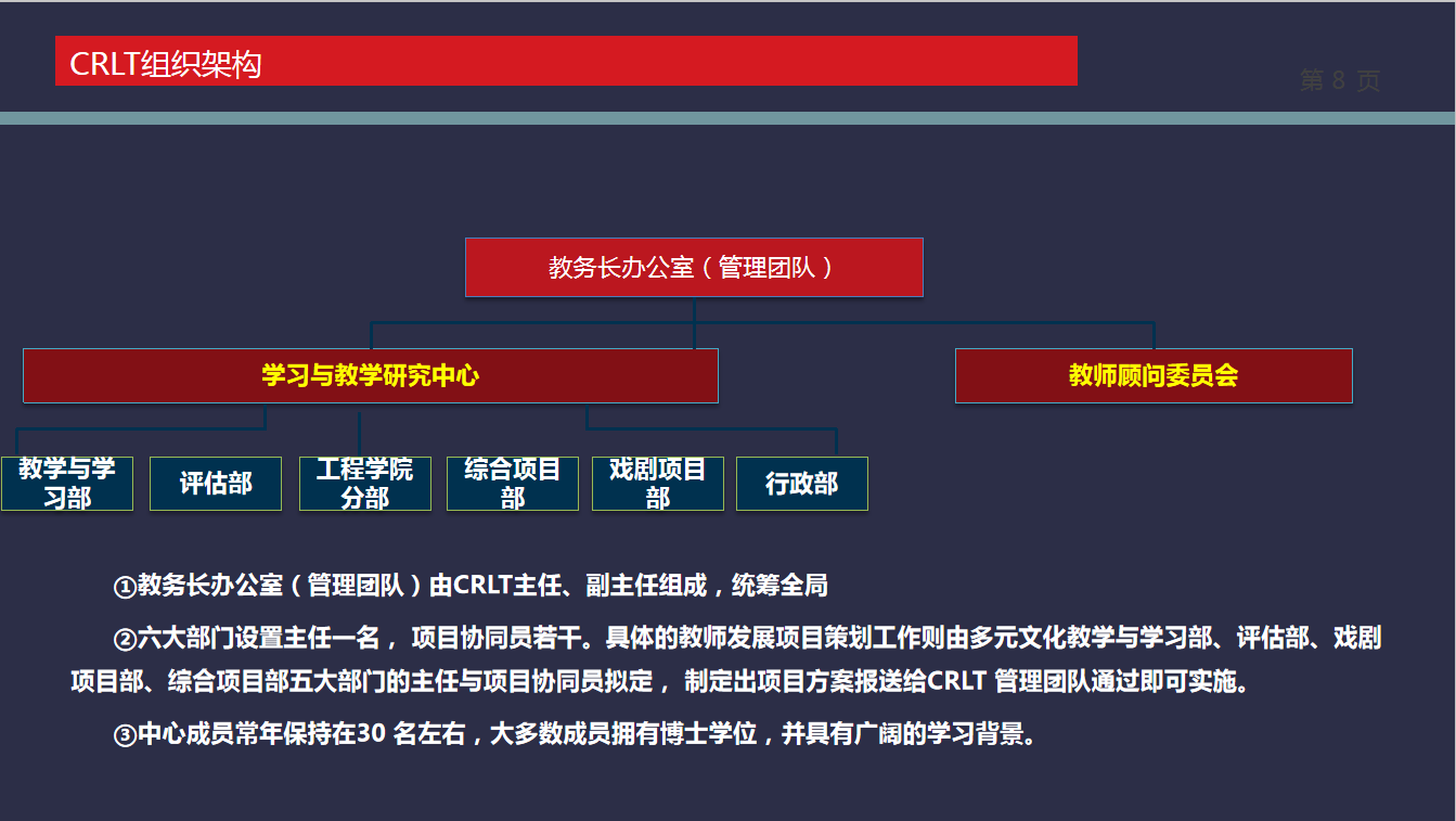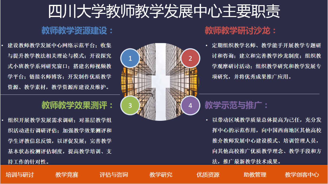 四川大学借鉴密歇根大学学习与教学研究中心的建设经验,创立了“融一流理念、重高水平服务”的四川大学教师教学发展中心。搭建了职责明确、教学经验丰富的专业化团队。开展教学资源建设、组织教师教学研讨沙龙、加强教学效果测评、进行教学示范与推广。为积极推动教师教学能力制定了一系列的激励与约束机制,提升教师改进教学的内生动力,并推动重奖激励;此外营造浓厚的教学文化氛围,搭建线上线下虚实结合的教学社区,提升教师教学能力。并关注助教培训与选聘,打造助教管理系统。通过对国内外四所高校的教师发展中心的调研,报告系统介绍了各中心为提升教师教学能力采取的措施,但同时也较为侧重各中心的异同的对比分析,为我院教师教学能力提升工作提供了思路。