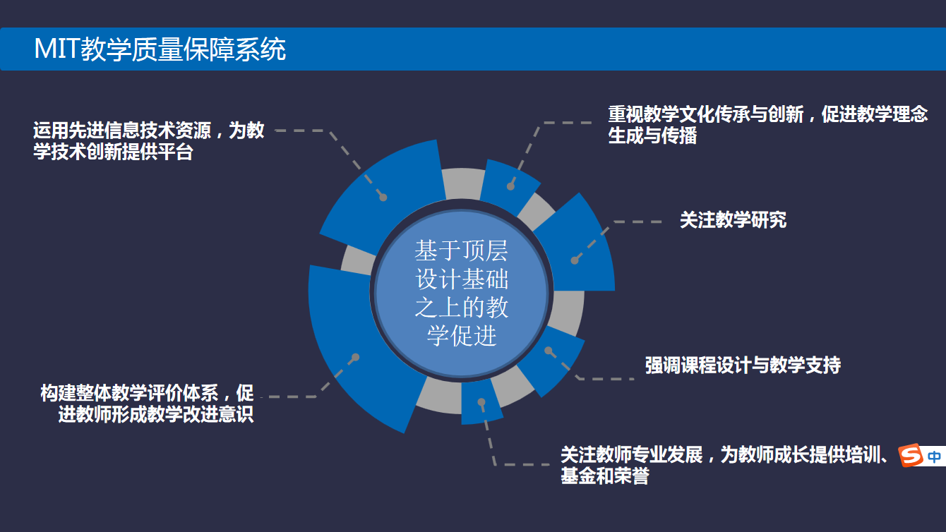 麻省理工学院教学促进系统自建立之日就以“促进课程设计创新、促进教学方法创新、促进教育技术创新”为目标,形成了权责明确的专业化组织结构。为了更好地促进教师教学能力,首先重视教学文化、教学理念对于教学的质量保障的基础作用;其次关注教学研究价值;强调课程设计与教学支持;为教师教学发展提供培训、基金和荣誉;构建整体教学评价体系、促进教师教学改进的意识与行动;运用现代的信息技术与资源,为教学技术创新提供平台。基于上述措施构建MIT教学质量保障系统,不断促进教师教学能力提升。此外,设立助教学分课程及助教教学证书项目,为助教的发展提供支持。