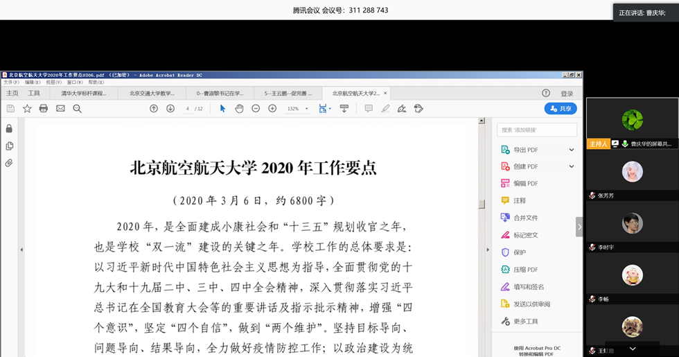 会议指出,各单位要统筹抓好疫情防控和落实学校重点工作,深刻认识北京疫情防控工作的重要性,提高政治站位和责任意识,遵守学校各项规定,切实把各项防控工作抓实、抓细、抓到位。要及时总结疫情防控有效做法,形成长效机制,完善相关制度;配合学校总体部署,扎实推进两校区双核发展;落实好学校关于人才培养、教师队伍建设、党的建设等方面工作要求;要进一步提升人才培养工作水平,形成北航特色的大类培养模式,进一步加强对学生美育、劳育的培养;学院要开展有组织的教学工作,推进国家级、校级一流本科课程建设。要继续落实“三个转变”,结合自身工作,全面提升学院制度建设和内部治理能力。
