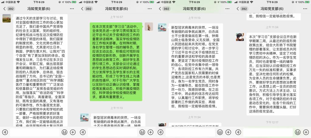 党支部根据《学生专组中期工作方案》,提前着手策划,充分讨论方案,借助“学习强国”平台和学校理论中心组学习材料,加强理论修养,增强党性认识,提高政治站位,筑牢疫情防控思想防线,确保思想不松懈,精神不放松。全体党员通过微信线上会议形式,集体学习讨论习近平总书记关于疫情防控工作讲话精神,及中央、上级部门、学校党委关于疫情防控工作的相关要求,对照方案部署书院近期重点工作,力求从严从实落实到位,增强了打赢疫情防控阻击战的信心和决心。各位党员在支部讨论平台积极发表学习感想,分享心得体会。