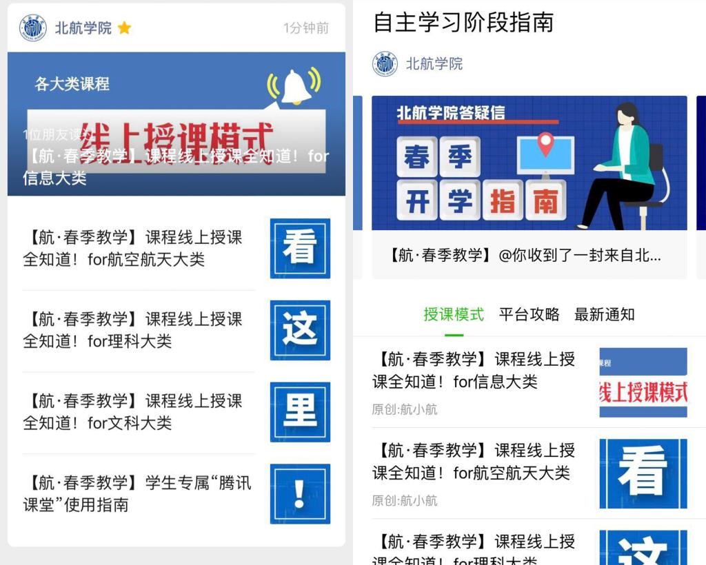 春季学期“延期开学不停学、停课不停教”对于基础课众多、学生人数庞大的365英国上市公司有着巨大的挑战。教学工作部骨干新建了一个“抵抗疫情、保障教学”的微信群,结合疫情情况讨论学院教学工作方案。随后,教务老师们全体投入战斗,每天十几个小时为线上教学的顺利运行做准备,制定学院延期工作方案、试用各种教学平台、在腾讯课堂创建260多门课程、为教师提供一对一帮助等等,她们说“保障教学顺畅,是我们能做出最好的贡献”。为了让每个同学都获得准确信息、少走弯路,教学管理团队想了很多办法,如:为每个大类的学生分别制作了春季学期教学情况介绍的视频,在线答疑为学生解惑;学院官方公众号总编辑张雪和教学秘书和佩佩、童玲欣、王彩霞等带领“航小航”团队,开创了“自主学习阶段指南”专栏,为同学们提供及时、准确、全面的一站式服务。