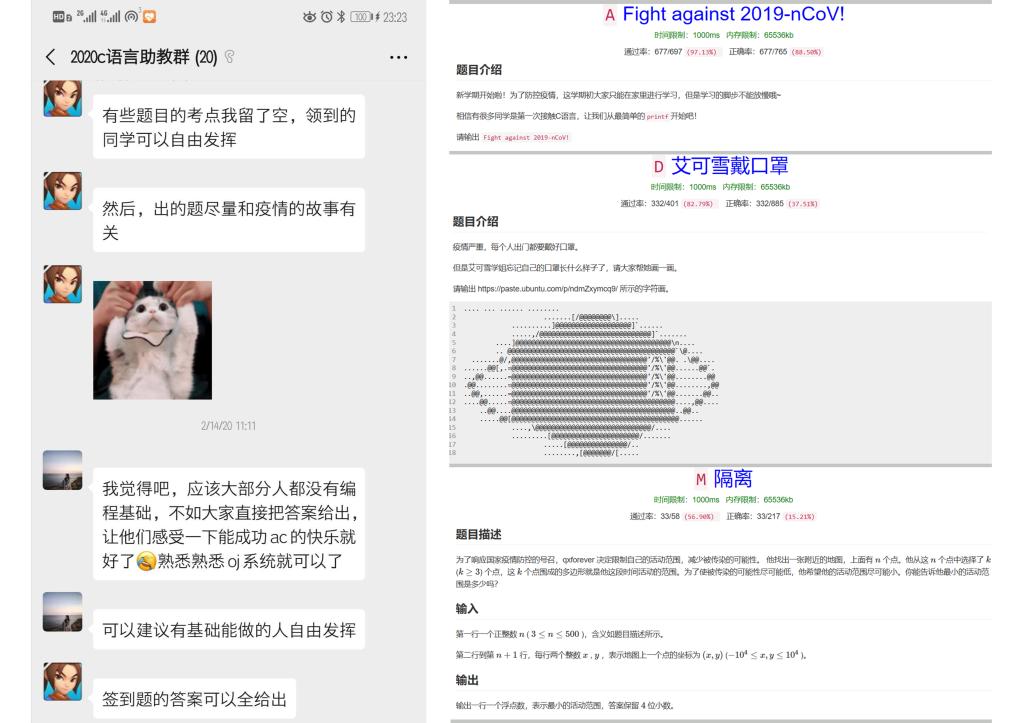 为了鼓励学生了解C语言,也让老师充分掌握学生的基础,程序设计课程群策划了“湖北加油防疫专题赛暨2019级航类脸熟赛”,并在老师自主研发的Online Judge在线检测系统上开放。系统开放后,700多位同学参赛,不少同学开始向助教请教问题,一问一答,收获知识与鼓励。虽然本课程尚未开课,但师生都已经渐入角色,老师和助教们已经开始通过查看学生代码分析那些从分数上无法体现的问题,在教学及辅导中开展针对性的讲解。