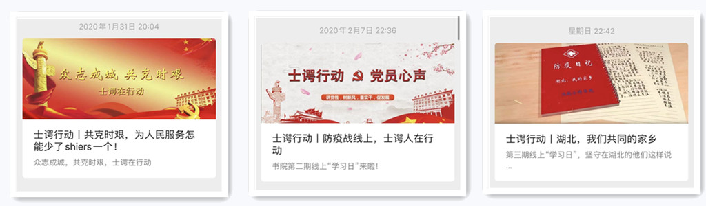 1月31日开始,书院在线上面向书院全体学生每周定时开展学习日活动。书院首期线上“学习日”对全国在疫情中涌现的优秀共产党员事迹进行了宣传,并发布了《士谔书院学生党支部致书院全体入党积极分子的一封信》。书院第二期线上“学习日”中,党支部全体党员结合防疫期间的学生工作谈担当、讲奉献,入党积极分子代表谈认识、讲体会,生动的讲出了在疫情防控战线上的“士谔故事”。书院第三期线上“学习日”推文以“湖北,我们共同的家乡”为主题,通过分享在湖北省学子的生活学习感受,加强学生对防疫工作的理解与重视,树立战“疫”信心。