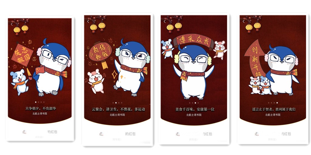 书院官方微信平台于除夕夜推出了书院专属微信红包封面。红包封面以“爱国、自信、博采、拓新”的院训为主题,采用依托封面故事的漫画形式,教育引导学生“云聚会、讲卫生、不熬夜、多运动”,宣传“美食千百味,安康第一位”的健康饮食观念,强化“谣言止于智者,胜利属于我们”的战“疫”信心。