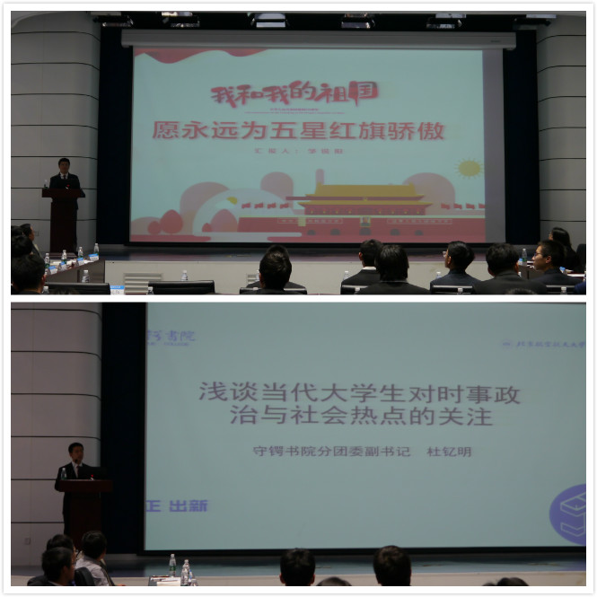 接着,由学生代表发言。学生会副主席张琼,新闻媒体中心副主任邹锐阳,守锷分团委副书记杜钇明,分别谈论了自己对学习生活的一些感受。张琼同学就如何平衡学习、工作、生活的关系发表见解。她以自行车为喻体生动形象地说明了工作要分清轻重缓急,让自己的任务处于动态平衡,并且要提高时间利用率,高效完成。邹锐阳同学通过讲述自己在中华人民共和国成立70周年参与千人合唱团的泪水和欢笑,娓娓道来永远为五星红旗骄傲的赤子情怀。杜钇明同学就目前某些大学生了解时政信息较少的情况做出思考,建议大学生主动关注新闻,提高自己的思辨能力,完善自己的人生观和价值观,成为国家所需要的人才。