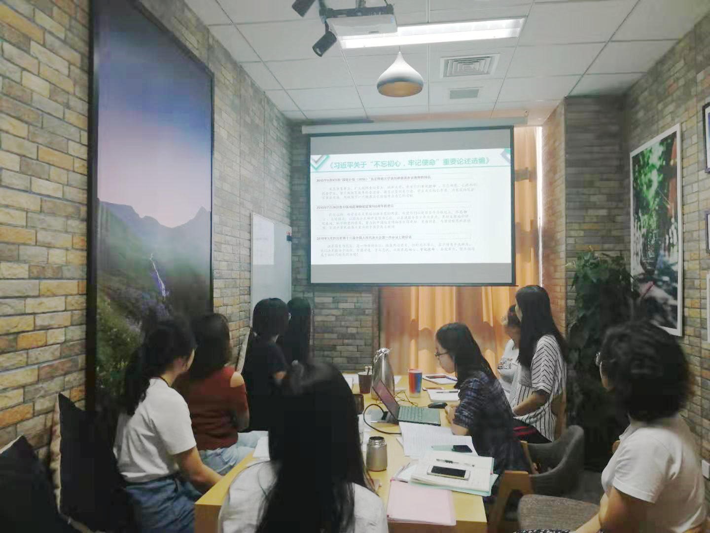 首先,由任小芳做《习近平关于“不忘初心、牢记使命”重要论述选编》及《习近平新时代中国特色社会主义思想学习纲要》的学习分享。她讲到,在新中国成立70周年之际开展“不忘初心、牢记使命”主题教育具有重要的意义,她选取了其中一些较为重要且与本职工作密切关联的内容进行介绍。分享结束后,大家就上述内容展开了激烈的讨论,大家都深刻认识到“我们决不能安于现状、贪图安逸、乐而忘忧,必须不忘初心、牢记使命 、奋发有为,努力创造属于新时代的光辉业绩”,一致认为我们要坚持初心,不断做好教育管理服务工作,更好的提升教学质量。