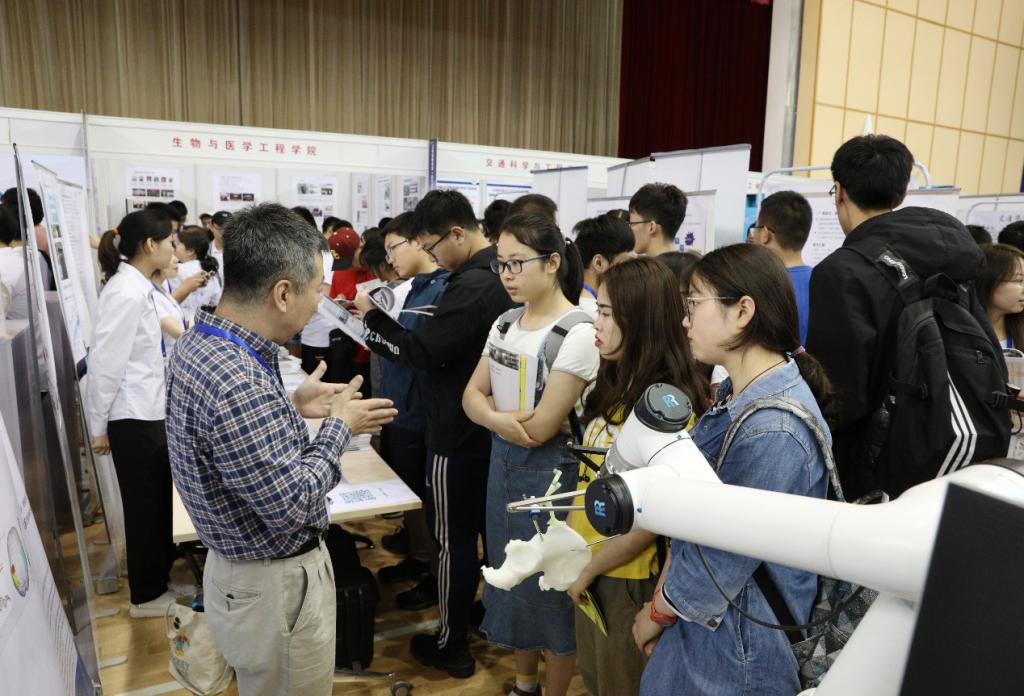 专业学院的展位前,同学们纷纷向老师提问“这个专业的优势是什么?”“有哪些特色的专业课?”“专业未来的发展方向是什么?”等问题,而老师们则结合专业科技前沿、科技实物展品和生活实例等对同学们的问题进行生动形象的说明。