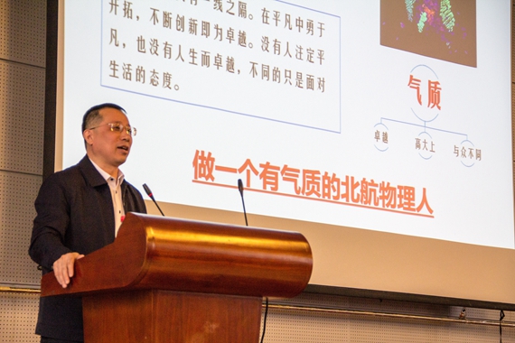 最后,吕院长表达了对同学们的厚望:期待同学们做一个有气质的北航物理人。他说:“平凡和卓越只有一线之隔。在平凡中勇于开拓,不断创新即为卓越。没有人注定平凡,也没有人生而卓越,不同的只是面对生活的态度。”以此表达了对同学们的祝愿。最后,他热烈期待同学们选择北航物理系,成为北航物理人。