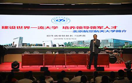 马进喜以《建设世界一流大学,培养领导领军人才》为题,为同学们介绍了北航的学科特色、办学优势和育人层次,鼓励大家报考北航,用幽默的、贴近高中生的语言拉近了与学生的距离,现场笑声掌声不断,得到了同学们的一致好评。