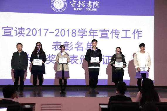接着守锷书院执行院长李广玉老师、团委书记韩庚老师分别为2017-2018学年新闻宣传工作表现优秀的集体和个人颁奖。2017-2018学年新闻宣传表彰大会共评选表彰新闻摄影奖5人,新闻撰稿奖8人,运营策划奖4人,媒体技术奖9人,先进个人9人,表现优异的集体两个,以感谢这些学生干部以及团队为书院宣传工作所做出的贡献。