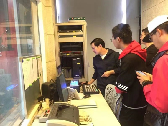 在湘麓老师的带领下,同学们参观了非新闻类节目的制作室,深入了解了新闻剪辑制作的过程与方法。随后在录音室里,同学们亲身体验了一次做主播的感受,体验了一次《职场帮帮团》的节目录制。最后在直播录制厅里,同学们体验了一把新闻直播主持人的感受。