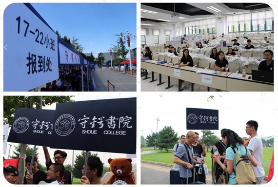 烈日炎炎下喊着守锷书院,闷热空气中举着相机,提着行李箱往返教学楼与宿舍,这些忙碌的身影都来自勤劳的迎新人员。在学校的校车停车点,新生和家长一下车,他们马上微笑着迎上去:“你好”,“欢迎来到学校”,并“抢”下新生和家长手中沉重的行李,带领新生去往守锷书院迎新处完成报道;在书院进行物资发放的教室,他们有条不紊地进行身份识别、信息核对、分发物品等工作;在教室外的照片板与合影墙,他们细心帮助学弟学妹们贴上照片并认真记录每一个瞬间;在校园内,宿舍中,随处可见他们忙碌的身影,在引导新生的途中一一回答新生和家长的各种问题,一路谈笑风生。