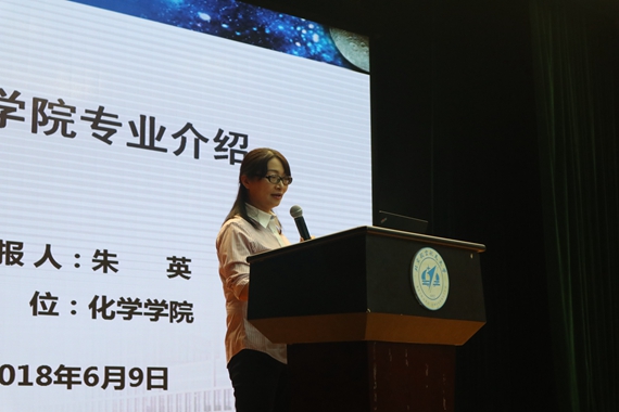 化学学院教学副院长朱英老师向大家介绍了化学学院的基本情况,对学院机构设置和学科点设置进行了简要介绍,同时就发展理念、发展目标和学科定位进行了展示。朱教授还向大家介绍了化学学院雄厚的师资力量,展现了化学学院丰厚的科学成果,由此展现进入化学学院拥有很多与学术界顶尖人才进行交流的机会。另外,还通过具体的表格形象化了化学学院的培养方案及特色模块,同时总结了化学学科的特点以及培养理念。