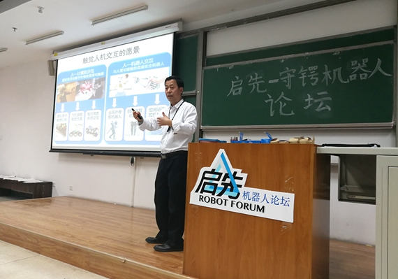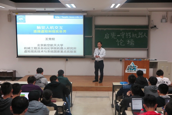 (通讯员 张丰川)4月11日晚,由守锷书院机器人协会承办的“启先-守锷机器人论坛”系列报告第二讲在J3-311顺利进行。北京航空航天大学机器人研究所王党校教授以《触觉人机交互:连接虚拟和现实世界》为题目,为同学们带来了一场精彩的报告。报告会由专职辅导员蒋茁主持,来自守锷书院、冯如书院、士嘉书院、大二专业学院共220名同学参加报告会。