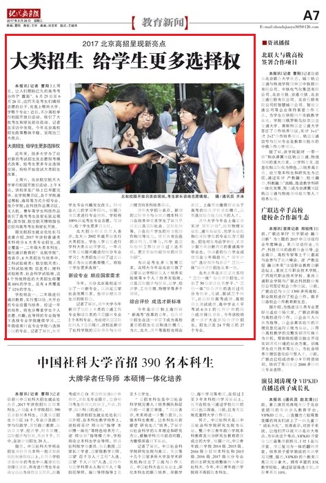 《现代教育报》2017年6月28日报道2017北京高招呈现新亮点,其中大篇幅报道了我校的大类招生: