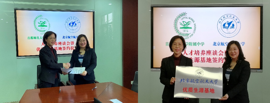 北航招生就业处处长邓怡、士嘉书院执行院长王雷华、学校招生就业处和北京招生组相关人员同首师大附中校长沈杰、校长助理任海霞及相关教师进行了座谈交流。邓怡首先介绍了北航近年来在人才选拔和培养工作中的情况,并分享了学校今年在招生专业设置以及强基计划等方面的一些调整,期待未来能够吸引更多首师大附中的优秀学子报考北航。沈杰介绍了学校的发展历程以及突出特色,阐述了学校一直以来传承的育人理念,并表示了对于双方开展协同育人合作的高度支持。随后,双方举行了“优质生源基地”协议签约及挂牌仪式。