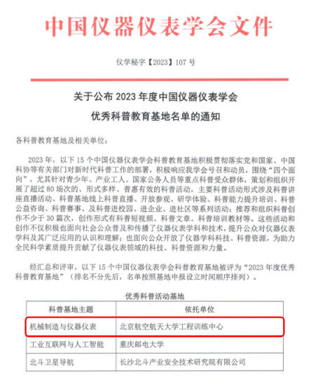 (通讯员 李志珑)近期,中国仪器仪表学会“2023年度优秀科普教育基地”评选结果揭晓,共有15个基地获评,北京航空航天大学工程训练中心喜获此殊荣,被评为优秀科普活动基地!